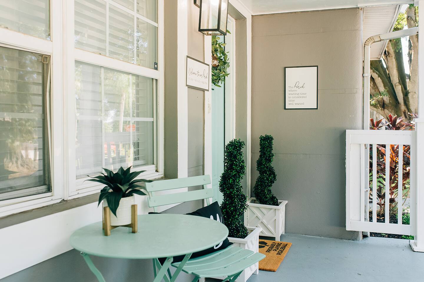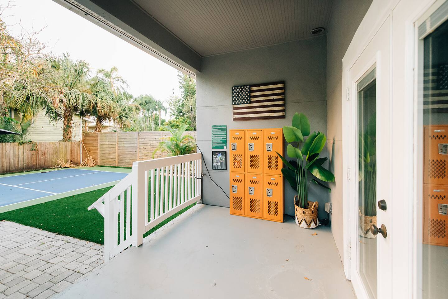 Front porch, backyard with turf and pickle ball court PLEASE NOTE: The driveway is shared with other guest who occupy the Tiny Home (There is no shared common spaces )