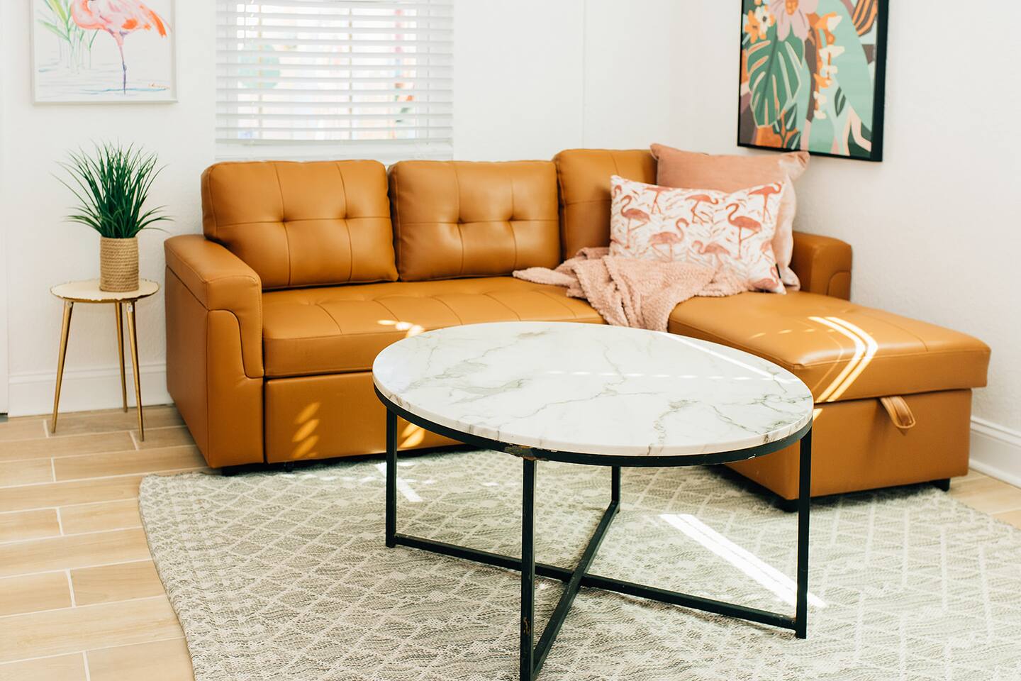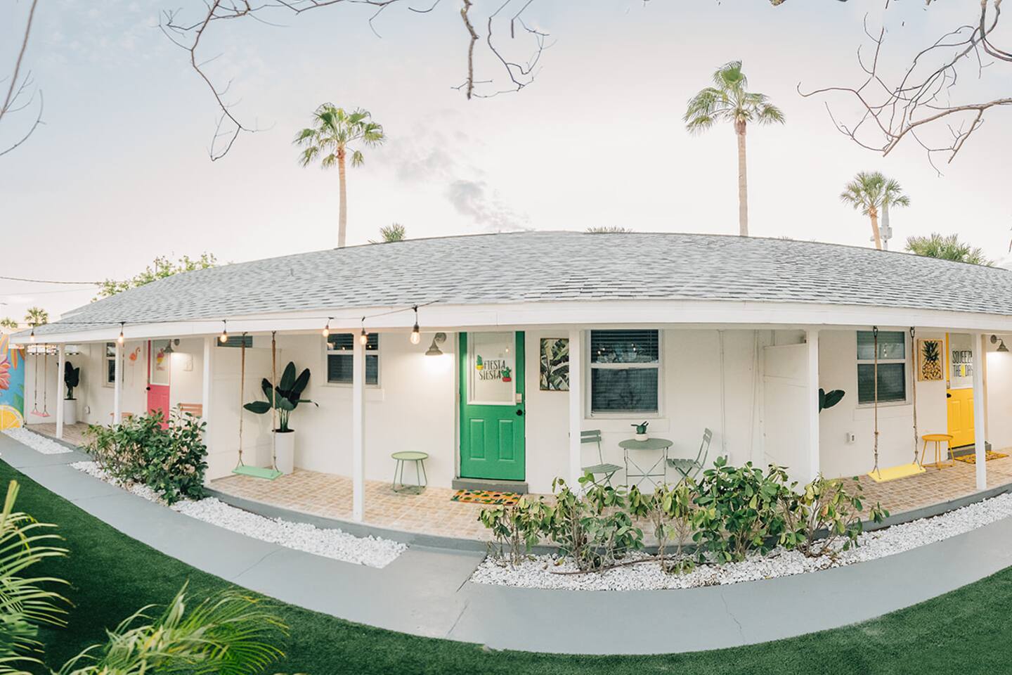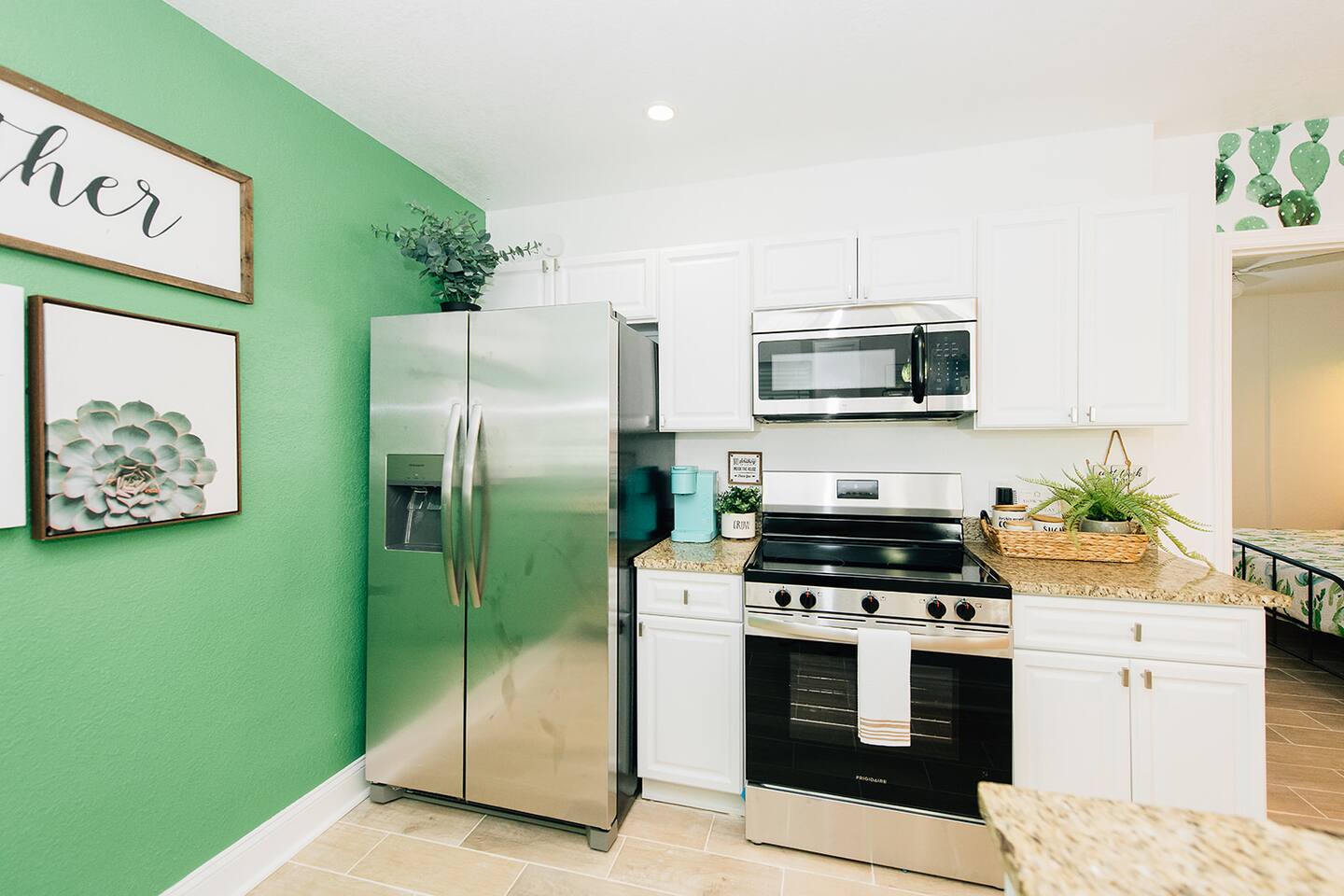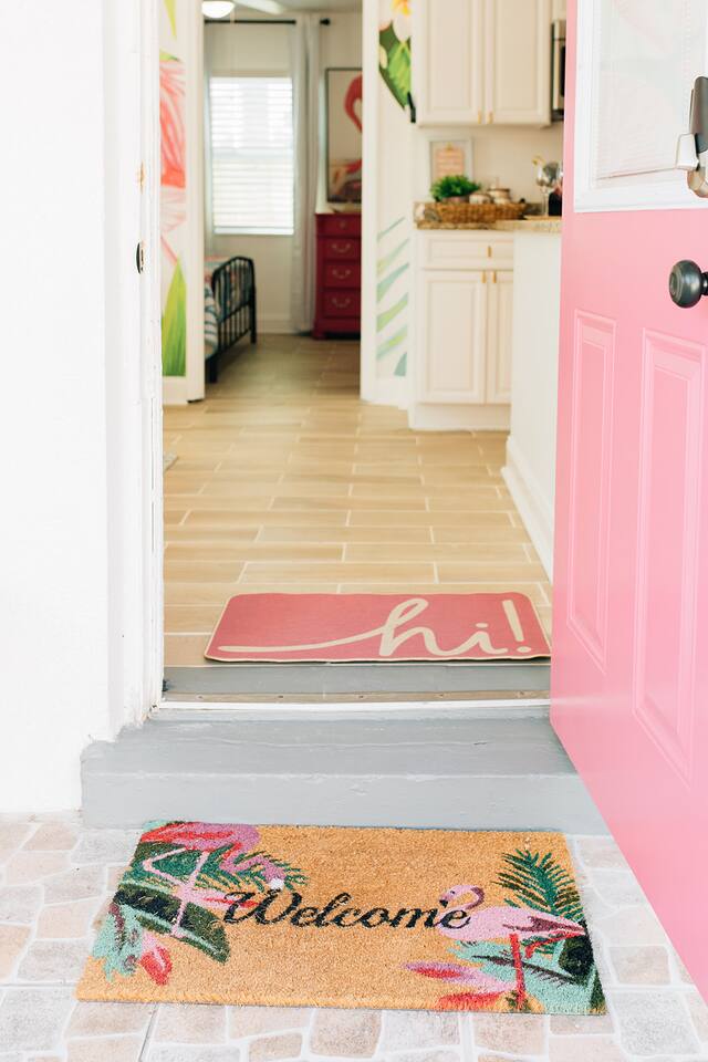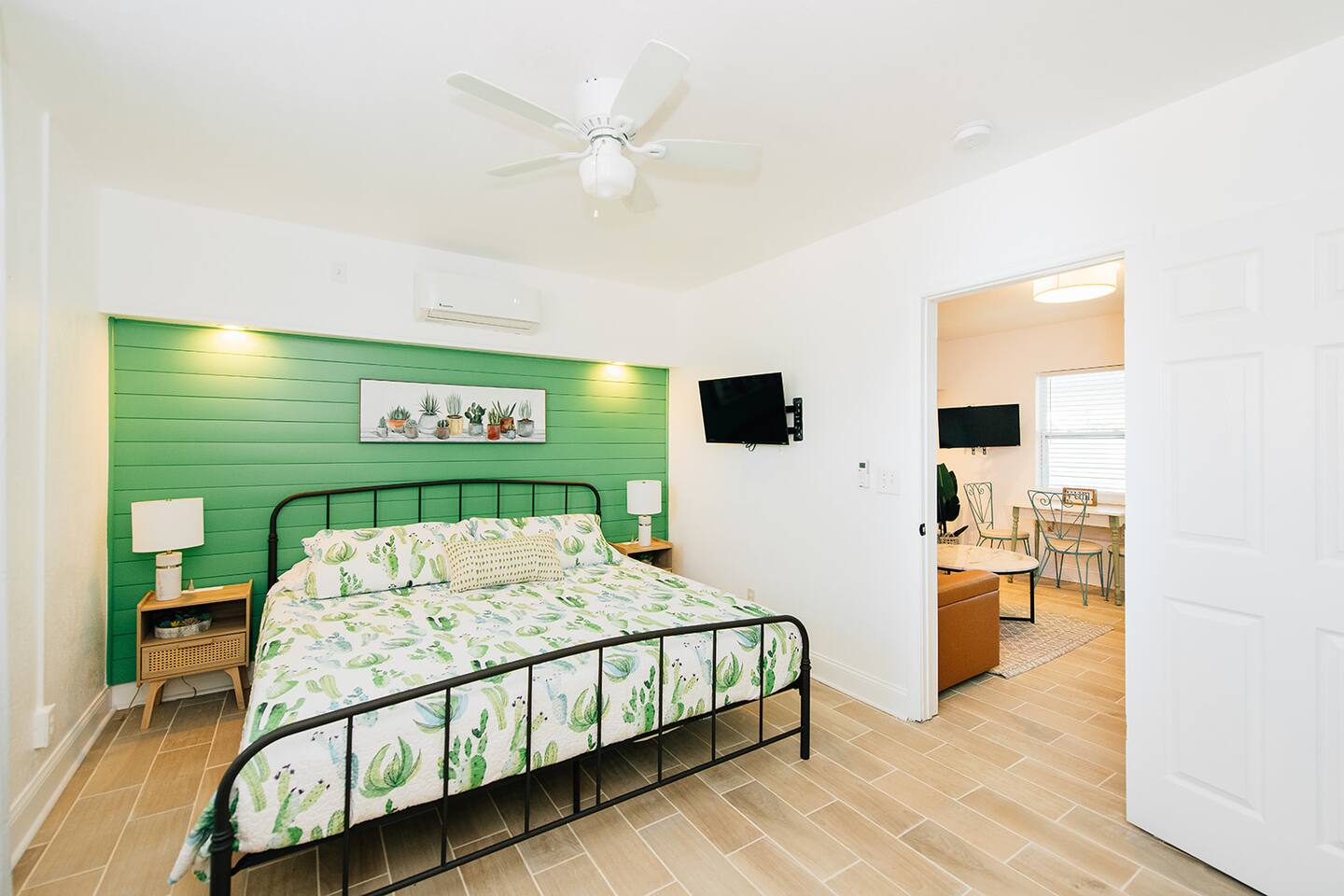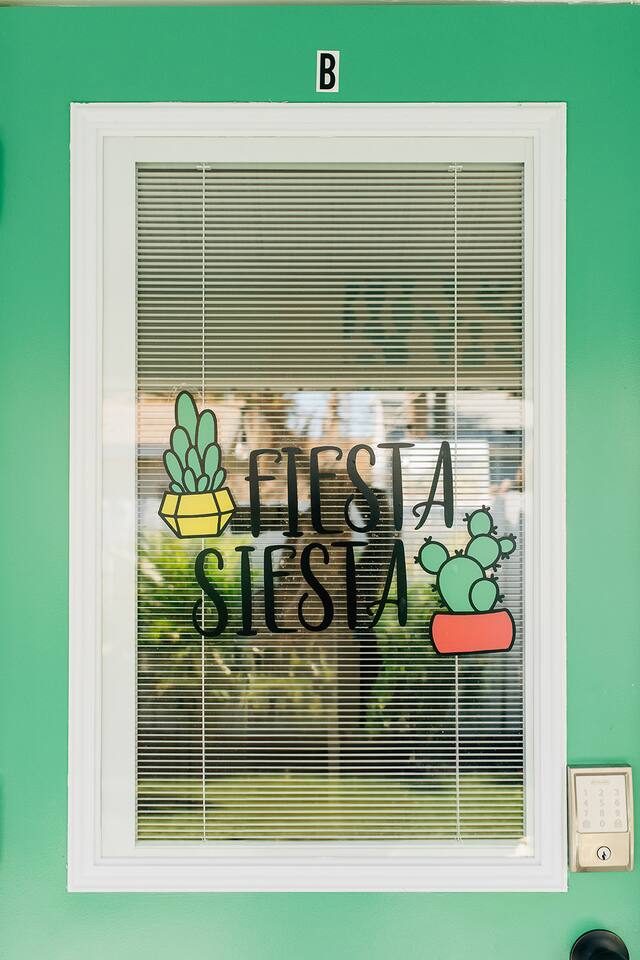 This booking combines 2 of our vibrant fun themed vacation 1 bedroom 1 bathroom units into a 2 bedroom 2 bathroom booking. It combines Lets Flamingle unit with Fiesta Siesta unit. While not inter leading they are next door to each other and perfect for 2 families. The living room has sleeper sofas and are better suited for younger children. Welcome to Florida, where the "state bird" is humorously said to be the mosquito! In our beautiful state, especially during the summer months, encountering pests like mosquitoes, bugs, and lizards is a common and natural part of the environment. This is not a cause for concern or panic and does not constitute a reason for a refund. Rest assured that all of our properties are serviced monthly by professional pest control companies to ensure the best possible experience for our guests. In fact, if you do happen to see a dead bug, it’s a good sign that the pest control is doing its job! We can confidently assure you that our units are extremely clean and meticulously cared for, and there are no infestations. Your comfort and safety are our top priorities, and we take great pride in maintaining a high standard of cleanliness and care. Thank you for understanding and enjoy your stay in our Florida home! Professional commercial laundry service is included for move-in and move-out to ensure 5⭐️ cleanliness.